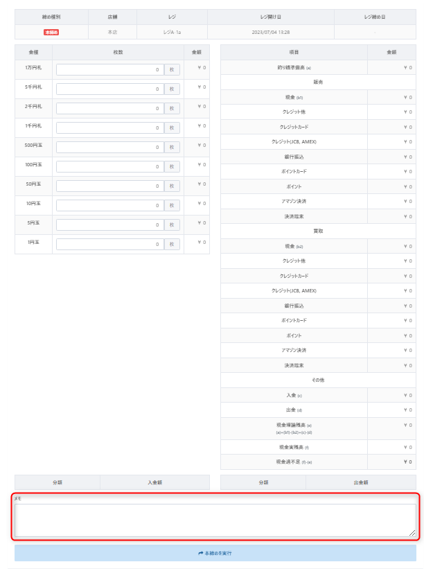 その際、【メモ】欄へ詳細状況を入力のうえ【本締めを実行】を行うことで、後日の確認の際に状況を把握していただきやすくなります。