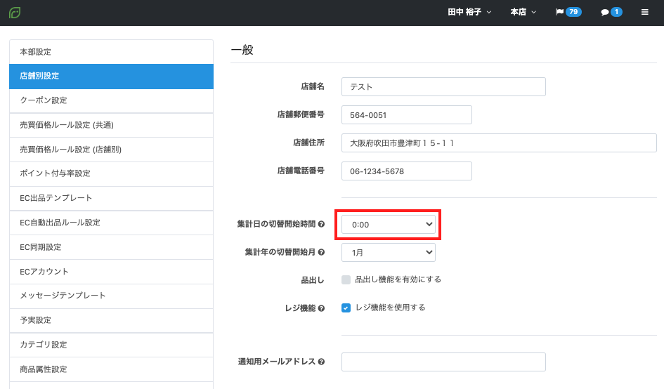 各店舗の場合、「設定>店舗別設定」の各店舗における店舗別設定にて「集計日の切替開始時間」に設定されている時間までに確定されたケース内容が、前日分として集計されます。