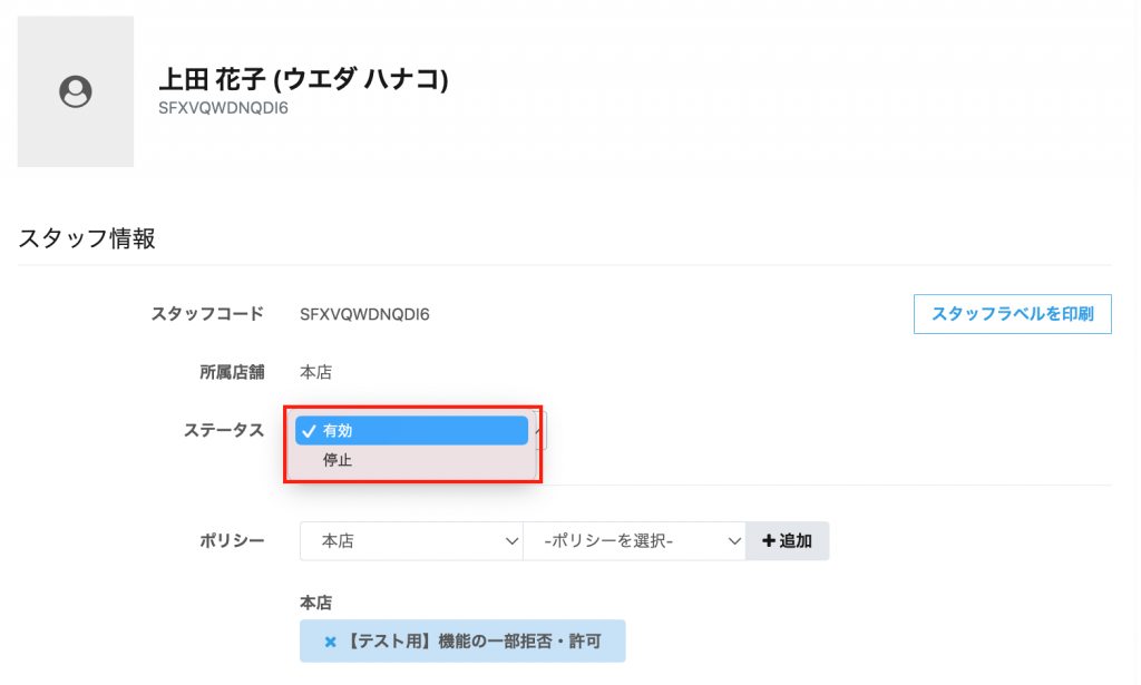 一方で、退職された場合もしくは誤って登録されてしまった場合は、【設定】メニューの【スタッフ・ポリシー】より当該スタッフコードをクリックのうえ、「ステータス」を『停止』へ変更し、「メモ」欄へ状況を記載のうえ、【スタッフ情報を更新する】をクリックして保存していただくことで、『有効』なスタッフを識別していただくことが可能です。