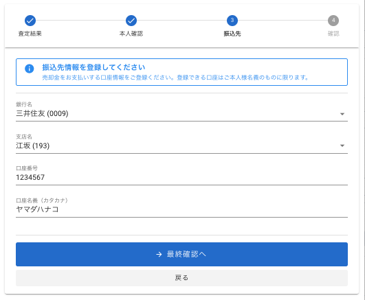 振込先情報を登録し、【最終確認へ】をクリックします。