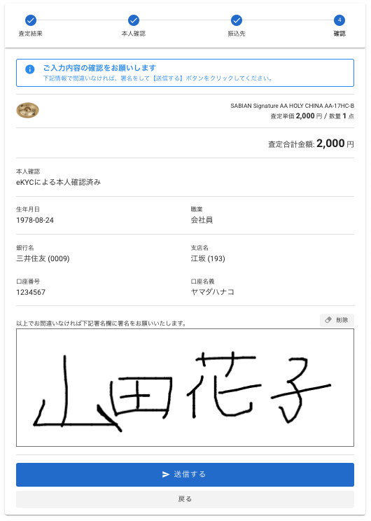 すると、先ほど入力した内容が表示されるので内容に間違いなければ、「署名」欄に署名を入力し【送信する】をクリックします。