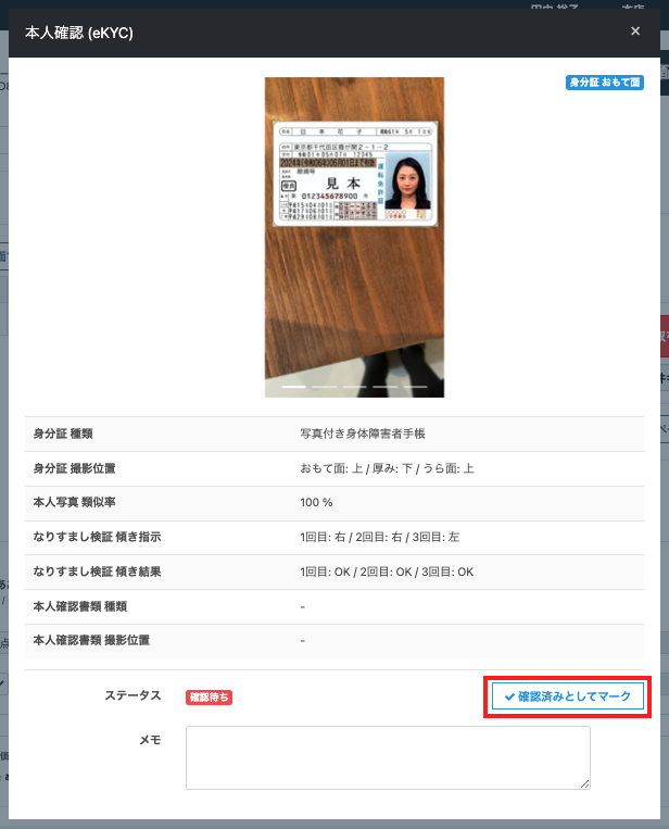 表示された【本人確認(eKYC)】画面にて内容を確認のうえ、問題なければ【確認済みとしてマーク】をクリックします。