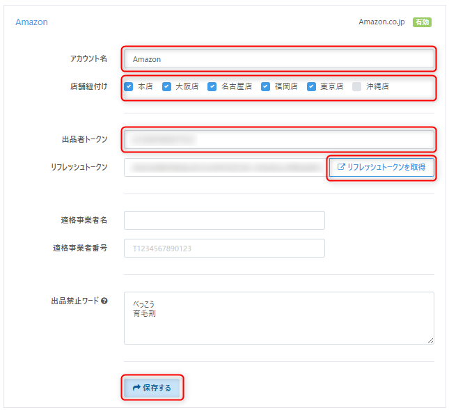 【設定>ECアカウント】画面の「Amazon」枠へ以下の必須入力の項目を入力後【保存する】をクリックし、ECアカウントの表示が『無効』から『有効』に変わると、連携可能です。