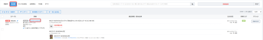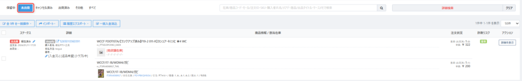 しばらく後にReCOREの【EC>受注管理】画面の該当注文の受注ステータスが『未出荷』へと反映されます。
