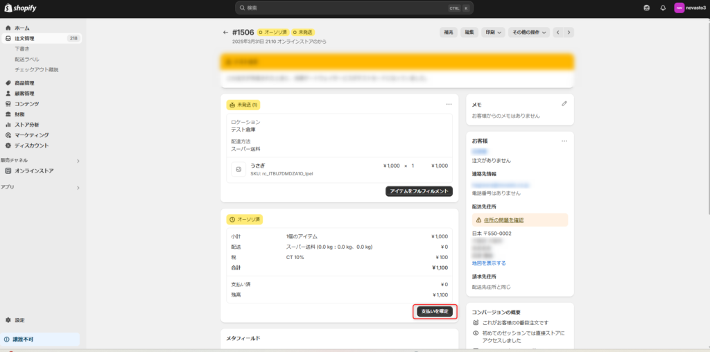 ②Shopify管理画面より、該当の注文の詳細画面から【支払いを確定】をクリックする。