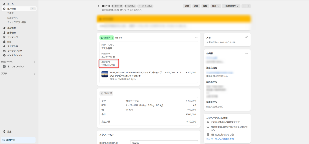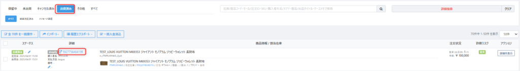 ③Shopify側で発送済みとなった後、ReCOREの【受注管理】においては自動で【出荷済】のタブに移動していることを確認する