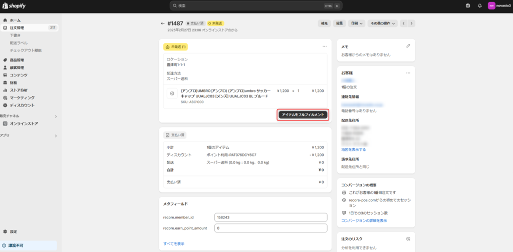 ReCOREから出荷処理の操作がエラーにより、『出荷済み』に反映されない場合、Shopify側より出荷処理を行ってください。