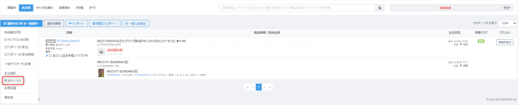 【受注管理】にて当該受注に対してチェックを入れ、【選択中の○件を一括操作】から【受注キャンセル】をクリックします。