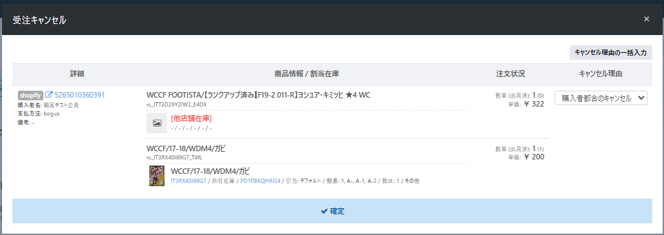ReCOREから受注キャンセルの操作がエラーにより、『キャンセル済み』に反映されない場合、Shopify側よりキャンセル操作を行ってください。