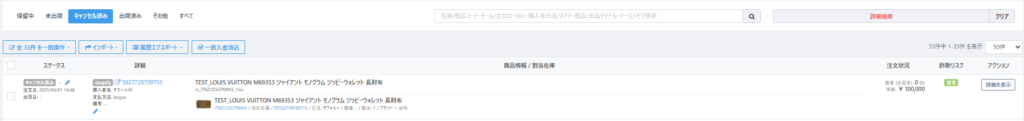 しばらく時間が経過するとステータスが『キャンセル済み』に反映されます。