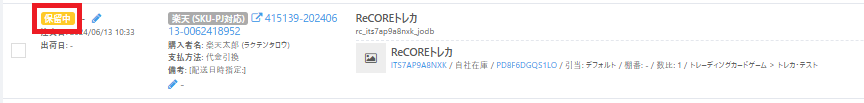 受注確認後、楽天側では「楽天処理中」のステータスとなりますので、ReCORE側では一時的に『その他』となります。