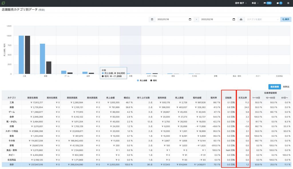 本ガイドではKPIの「買取・販売分析」に表示される「回転数」と「交叉比率」について解説します。