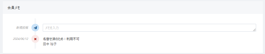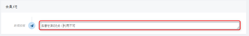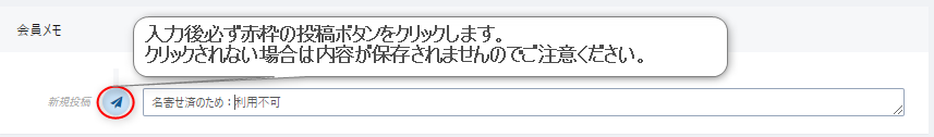 会員の詳細画面の【会員メモ】欄に『名寄せ済みのため:利用不可』などを入力のうえ、【新規投稿】ボタンをクリックして情報を保存します。