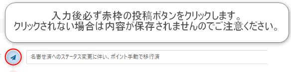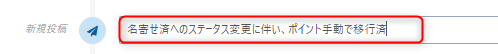 ポイント付与後、会員の詳細画面の一番下にある【会員メモ】欄に『名寄せ済のポイント手動で移行済』などを入力し、【新規投稿】ボタンをクリックして情報を保存してください。 手動でのポイント付与を行った背景などを記録されることを推奨しています。