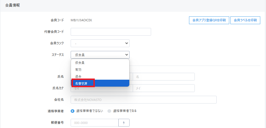 重複登録が発生した際は、不要となる会員コードのステータスを「名寄せ済」へ変更 してください。
