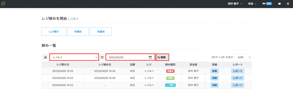 締め一覧で確認したい「レジ名」と「締め日」を選択のうえ【検索】ボタンをクリックして表示させます。