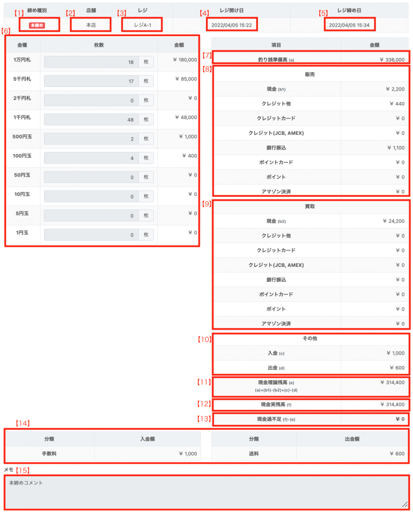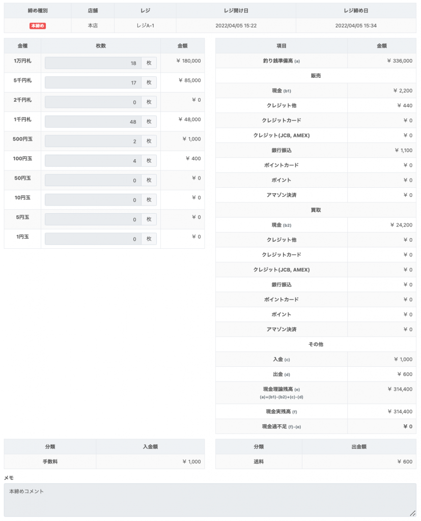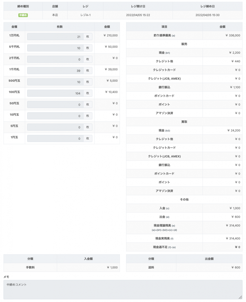 レジ締め時に、補足事項として「メモ」欄に入力した内容が表示されます。
