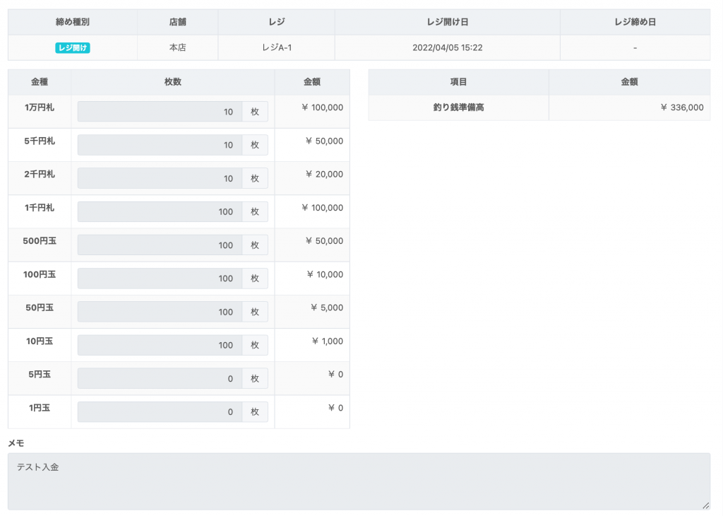 レジ開け時に、キャッシュドロアーへ投入された現金の合計金額が表示されます。
