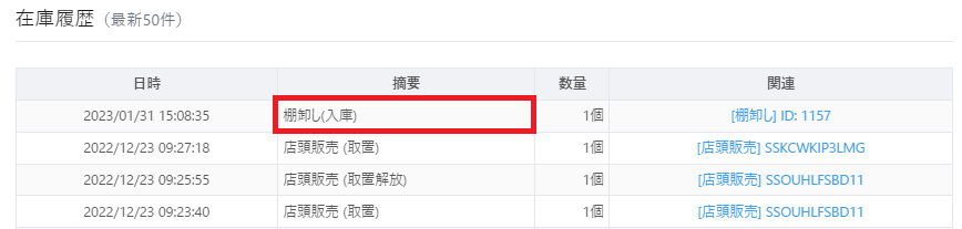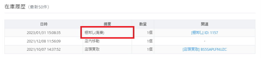 また、在庫詳細の『在庫履歴』項目では、棚卸しによって廃棄・入庫された在庫について以下のように表示されますのでご参照ください。