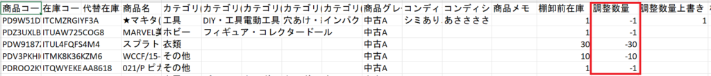 以下の画像は出力されたExcelデータの見本となり、廃棄済みの在庫は赤枠内で数量がマイナスの表記となります。