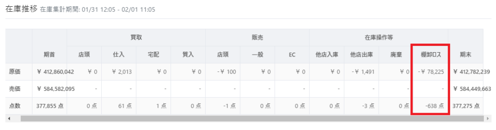 なお、棚卸しによって廃棄、入庫された在庫の原価と在庫数の合算が表示されます。