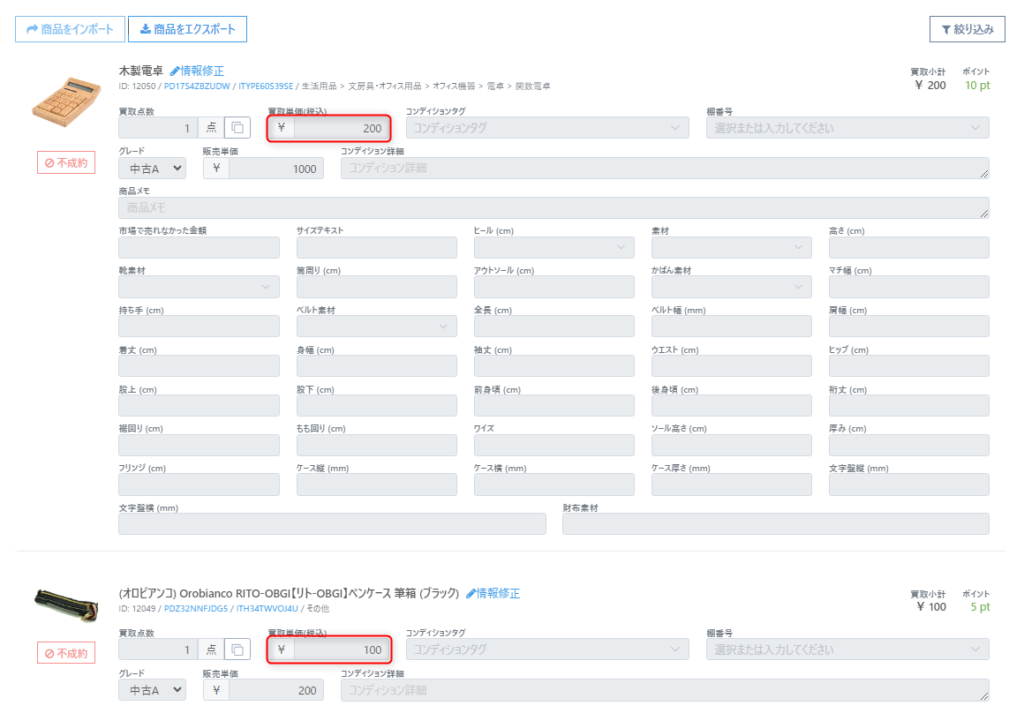 買取単価と数量応じて小計調整の金額は按分されます。 商品①「買取単価(税込):200円」「小計調整:40円」 商品②「買取単価(税込):100円」「小計調整:20円」