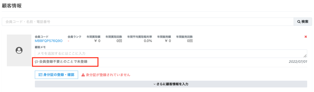 一方、店頭メニューより同会員コードを呼び出しすると、先ほど登録された会員メモが同時に表示されます。