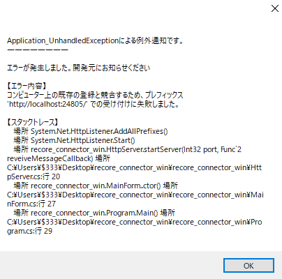 原因➁:既にRECOREコネクターが立ち上がっている状態で更に新しいコネクターを立ち上げようとした場合も、こちらのエラーが発生します。
