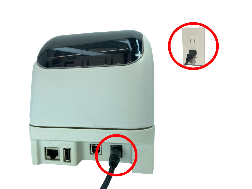 ・キャッシュドロアーのケーブルは、電源ケーブル差し込み口とは別の赤枠で囲まれたポートに差し込んでください。電源ケーブルの右横にあるポートとは異なりますので、ご注意ください。