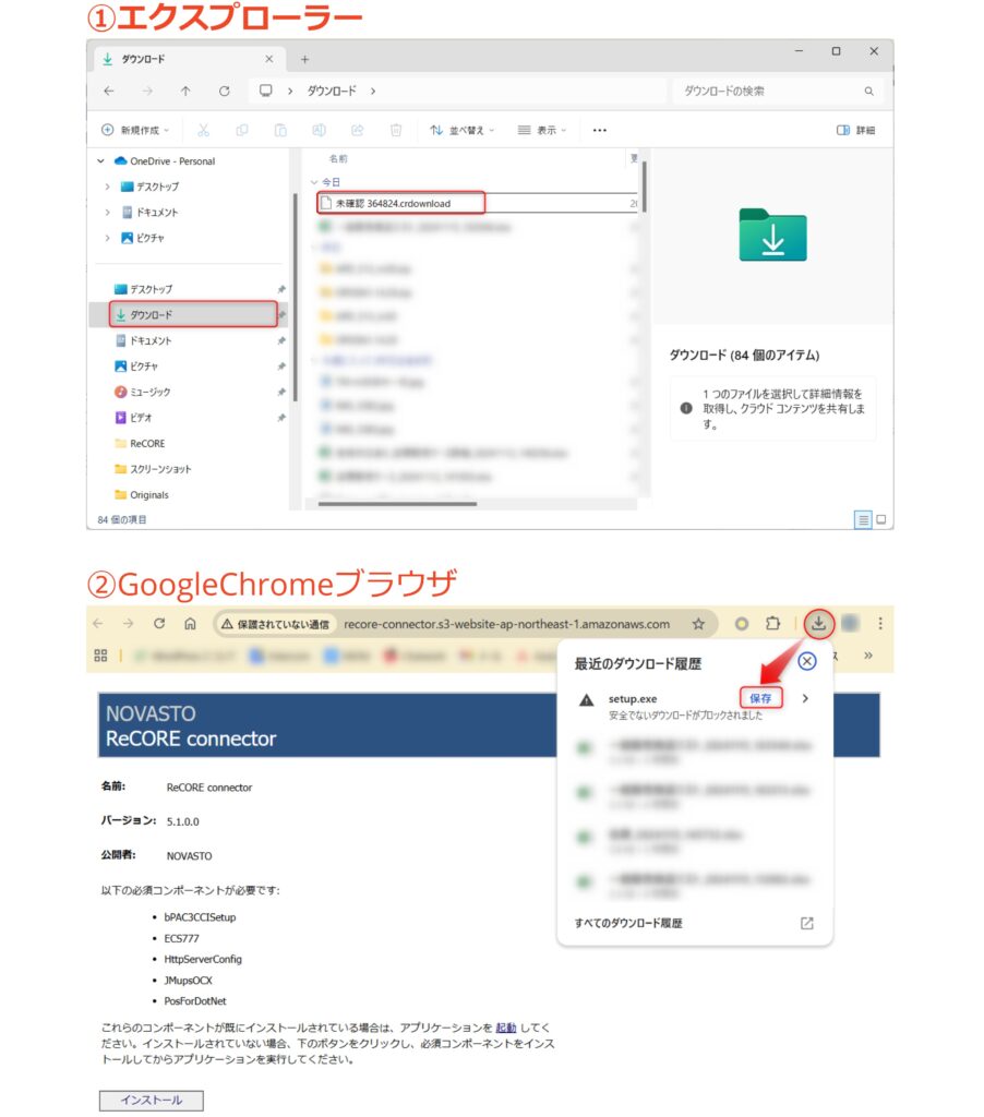 RECOREコネクターのインストーラーファイルをダウンロードする際、確認メッセージが表示されたり、PC側でダウンロードをブロックされる場合があります。