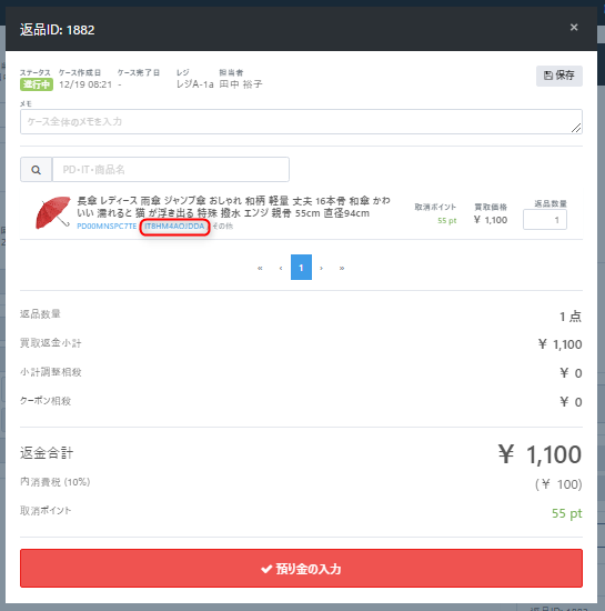 後日把握しやすいように、当該ケースの【ケースメモ】欄やレジ締めレポートの【メモ】には、処理日・ケースコードなど詳細状況を記載します。