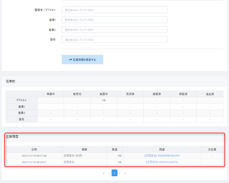 返品処理画面に表示された在庫コード(ITコード)をクリックのうえ、在庫の詳細画面の下部にある【在庫履歴】をご確認ください。