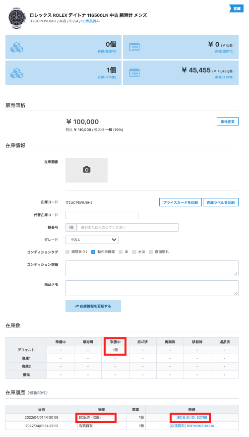 在庫数:「取置中」に『1個』表示されています。 在庫履歴:最終履歴の「適要」に『EC販売(取置)』にて「関連」の『[EC受注] ID: 52768』をクリックします。