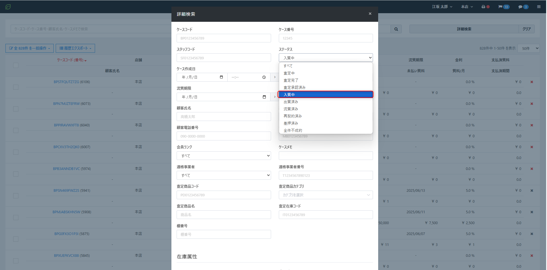 ①【質入れ>ケースリスト】画面の【詳細検索】よりステータス【入質中】を指定して【検索】ボタンをクリック