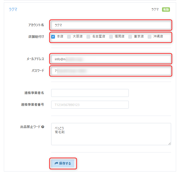 【設定>ECアカウント】画面の「ラクマ」の枠へ以下の必須項目を入力後【保存する】をクリックし、ECアカウントの表示が『無効』から『有効』に変わると、連携可能です。