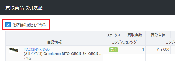①【買取商品取引履歴】画面に表示されている「他店舗の履歴を含める」にチェックを入れてください