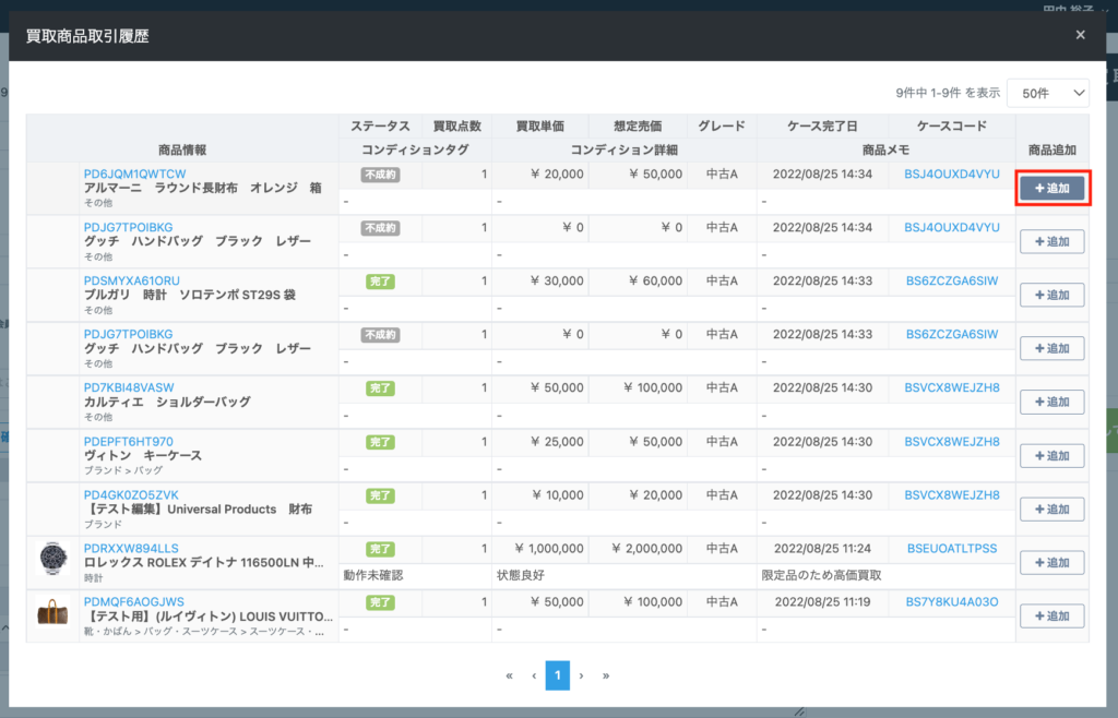 なお、【買取商品取引履歴】画面で該当する商品の【+追加】ボタンをクリックすることで、【店頭買取>新規買取】画面の買取商品に商品登録することも可能です。