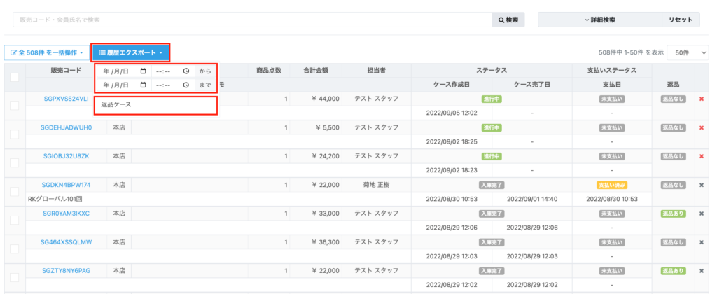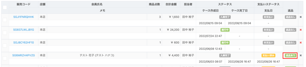 【ケースリスト】画面では、「返品」項目に『返品あり』と表示されている場合、買取コードなどのケースコードをクリックし、返品IDをクリックすることで画面で確認することが可能です。