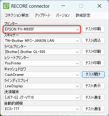 RECOREコネクターの「プリンター」項目に機器名が表示されているかどうか確認します。
