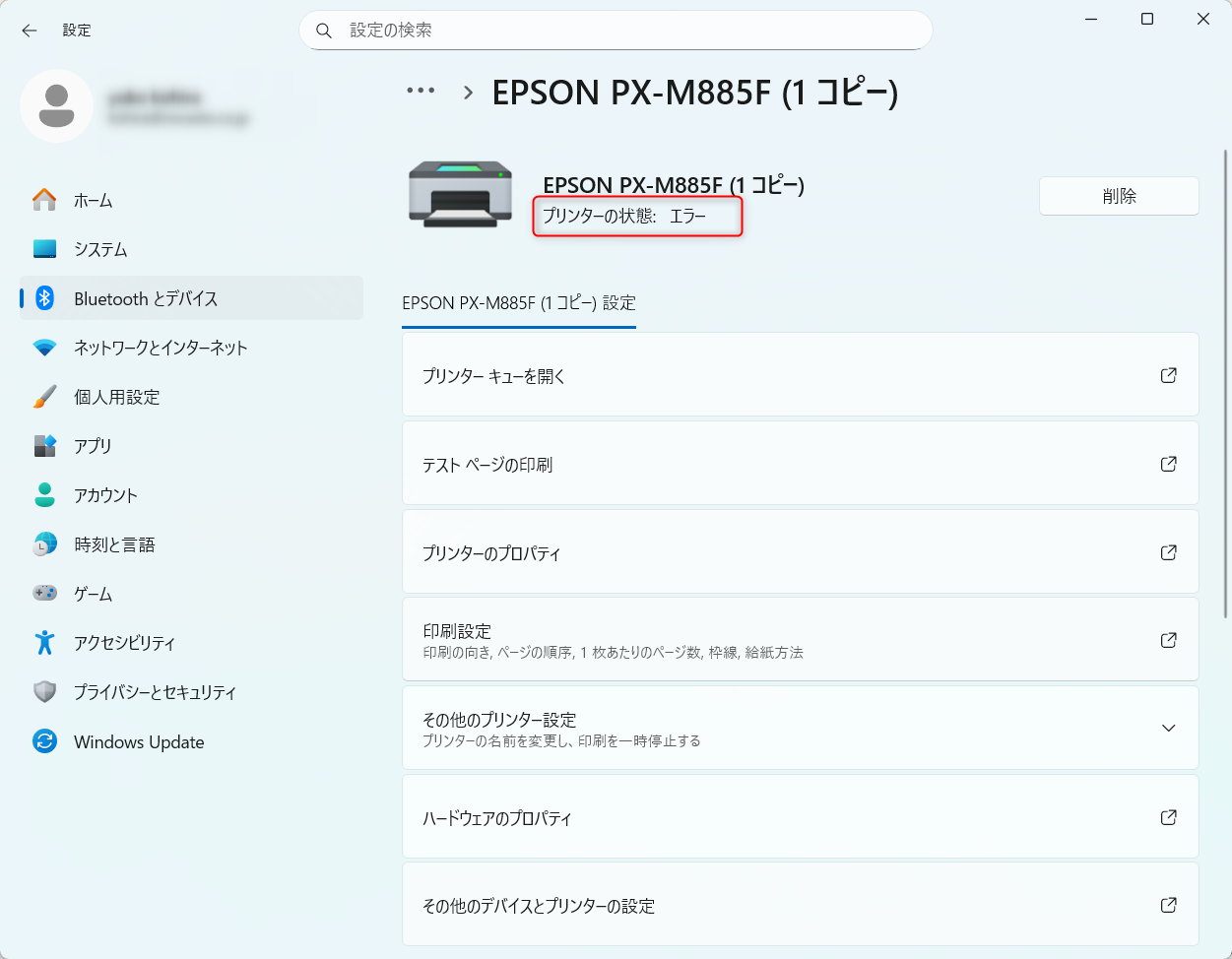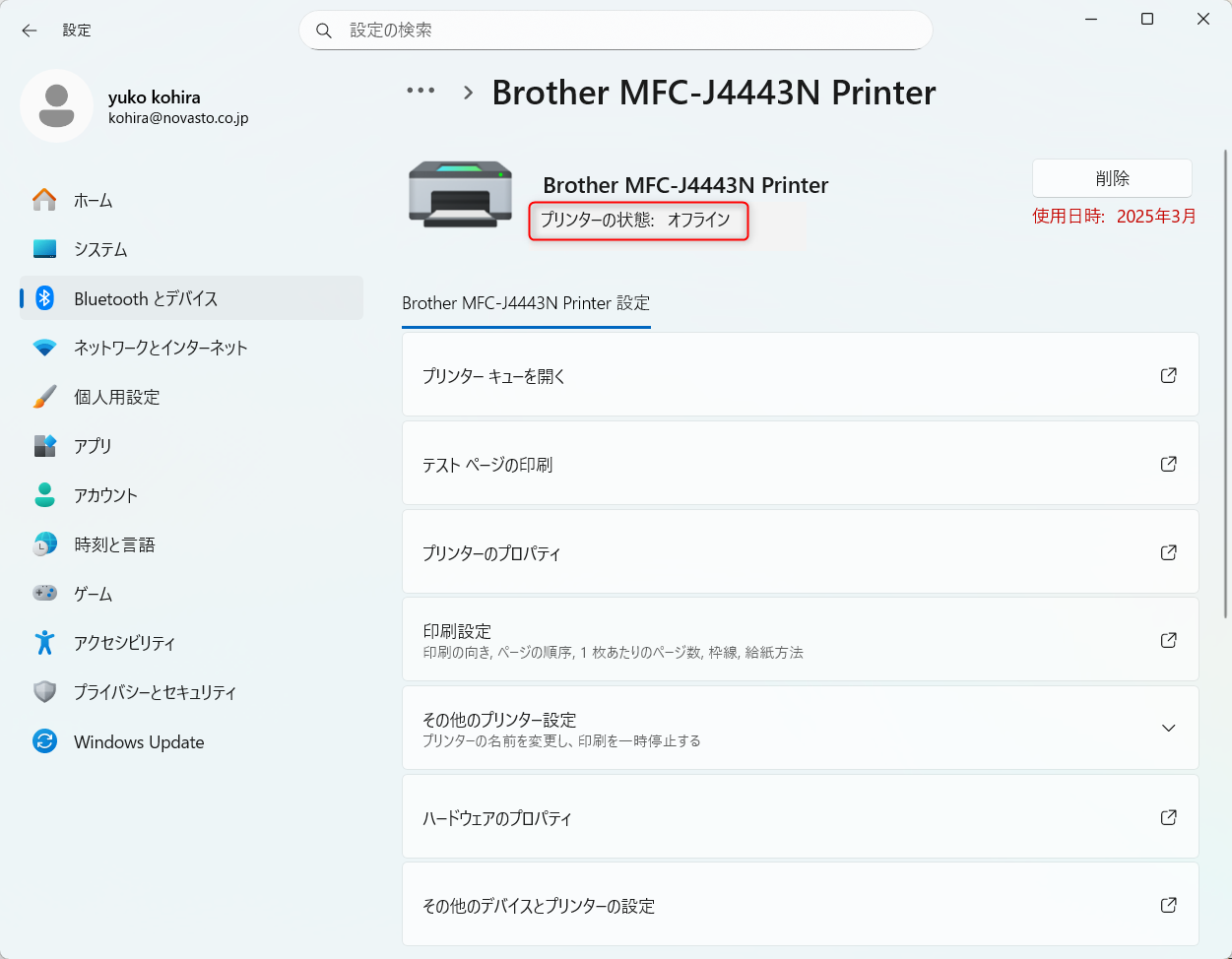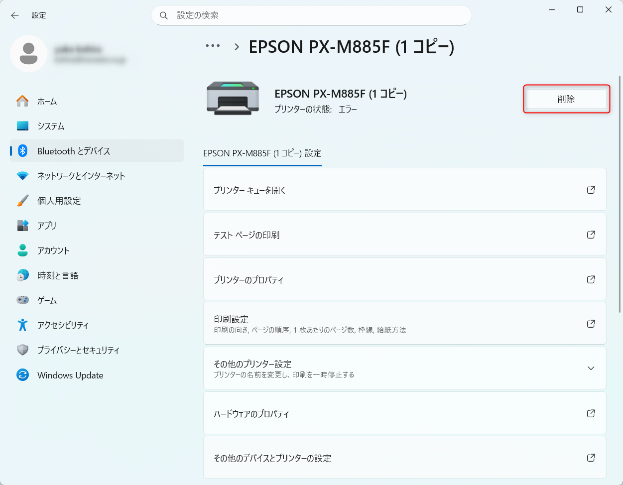 ❷【設定】→【Bluetooth とデバイス】→【プリンターとスキャナー】を開き、表示されている該当の機器名をクリックして【削除】を選択し、デバイスを削除します。