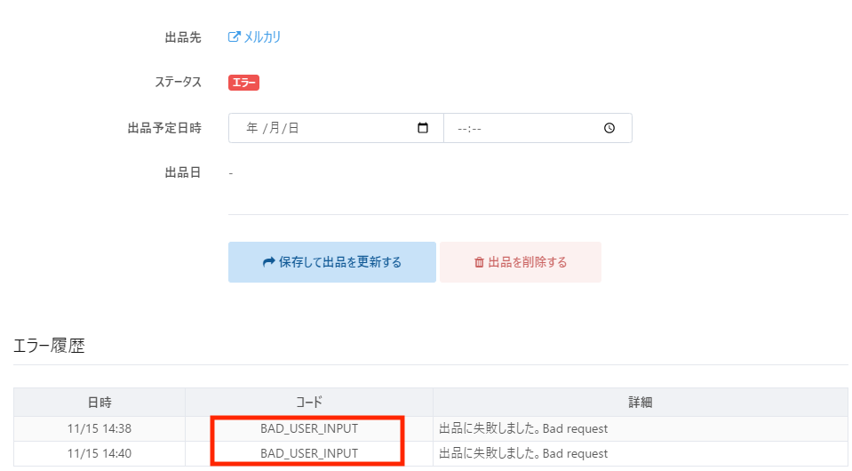 エラー『BAD_USER_INPUT 出品に失敗しました。Bad request』