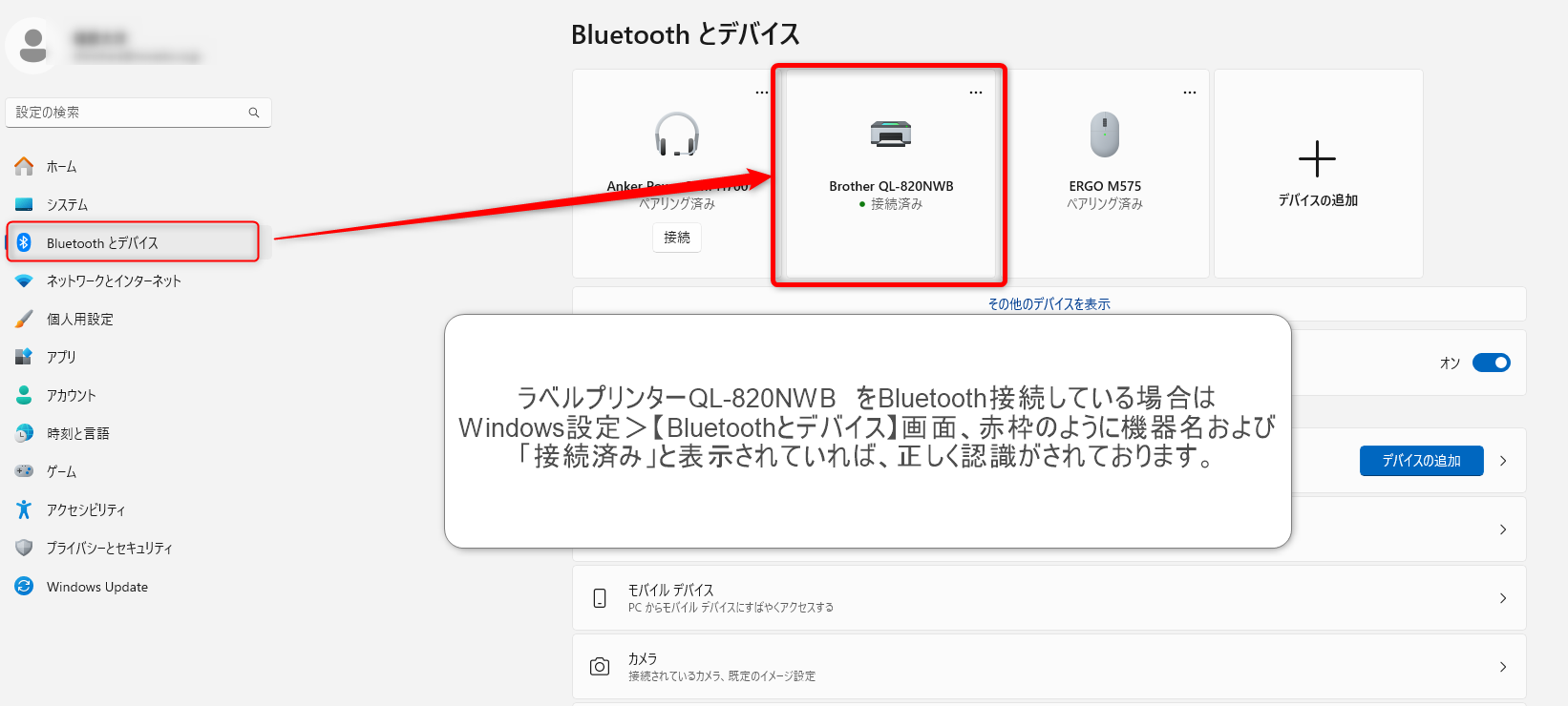 ①Windows設定>【Bluetoothとデバイス】画面、赤枠のように機器名および「接続済み」と表示されていれば、正しく認識がされております。