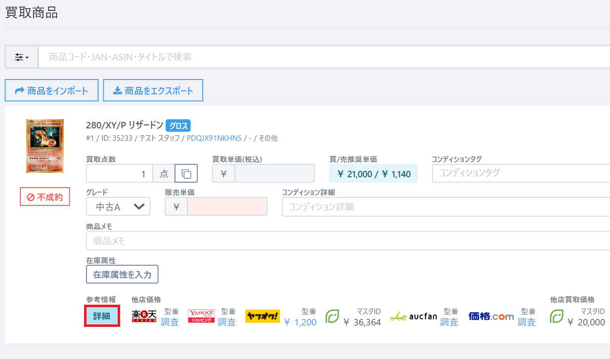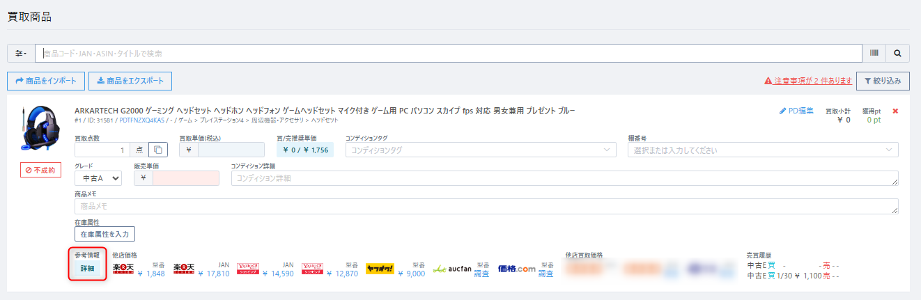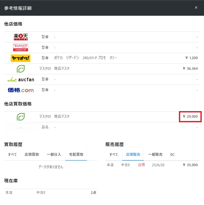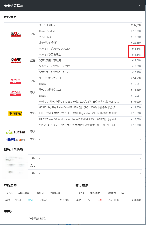 参考情報からは各ECモール等の売買情報だけでなく、自店舗や他店舗での売買履歴、各店舗の在庫数を確認することも可能です。