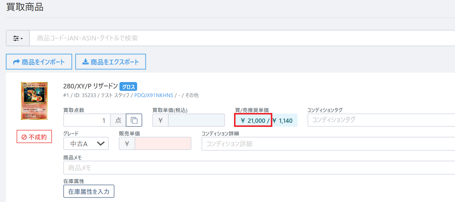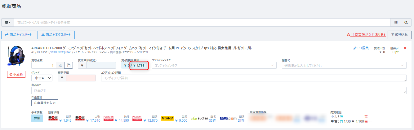 【店頭買取】での買取商品に表示される「買/売推奨単価」は、売買価格ルール設定と参考情報詳細の価格を元に算出しています。