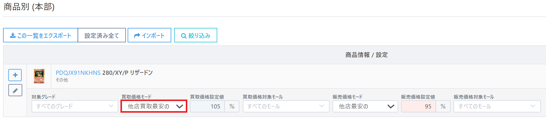 以下のように【買取価格モード】に『他店買取最安』を設定し、