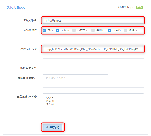 メルカリShopsの管理画面で取得したAPIアクセストークンを入力