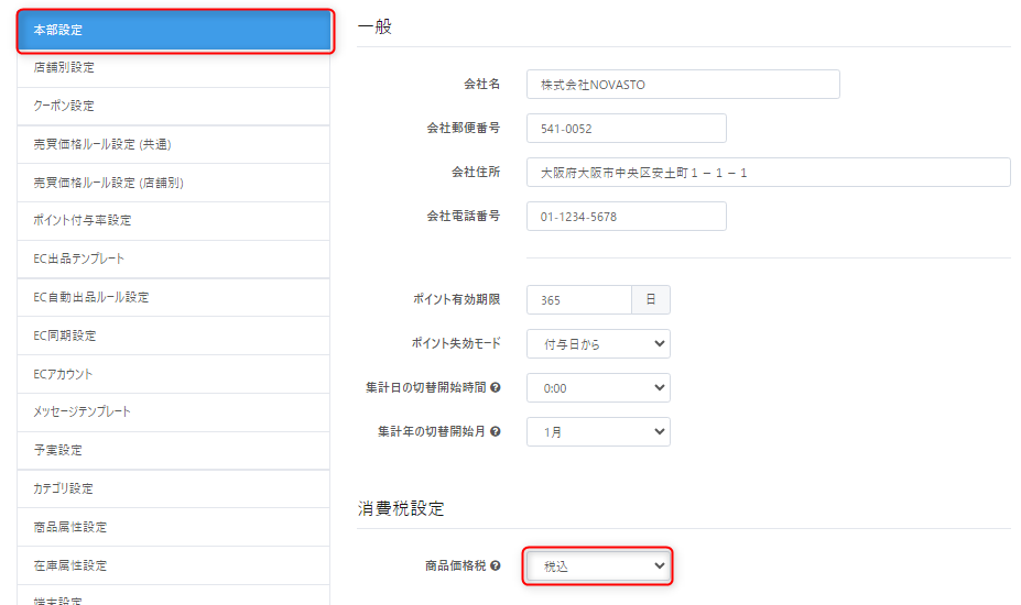 販売価格は【設定】メニュー【本部設定】の「消費税設定」の設定