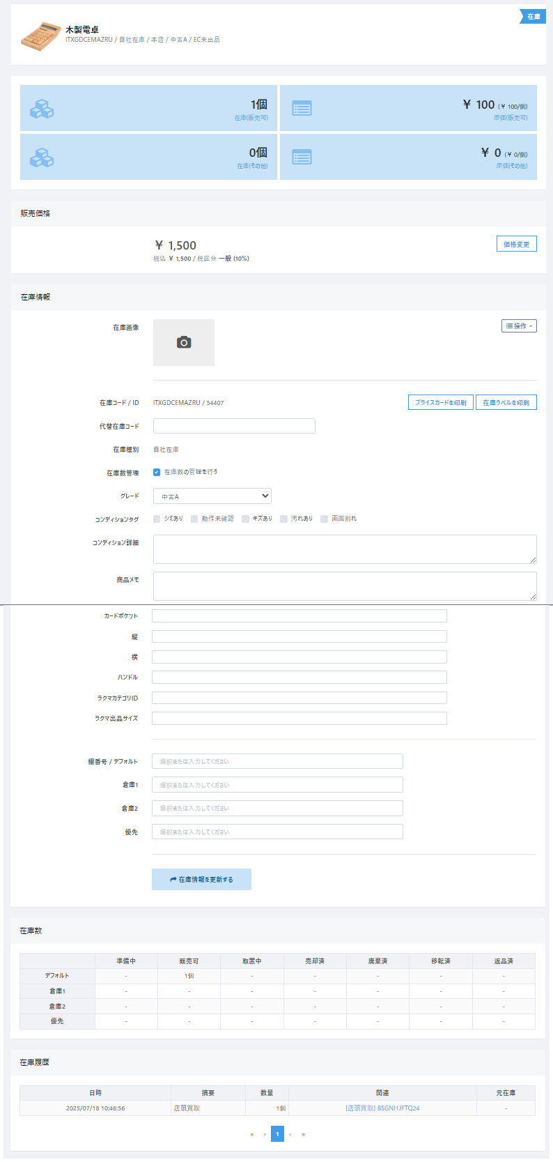 1 | 店内のロケーション | デフォルト:通常、買取仕入された商品後の保管場所 倉庫1・倉庫2:店頭以外でEC販売のみ行う在庫の保管場所 優先:店頭販売・一般販売のみで販売したい場合の保管場所 |
