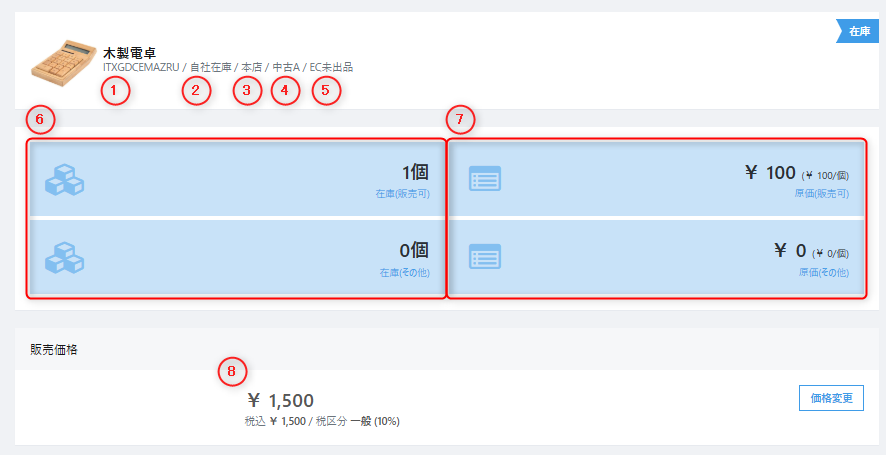 在庫数:当該在庫における店内保管場所と商品の状態を表示