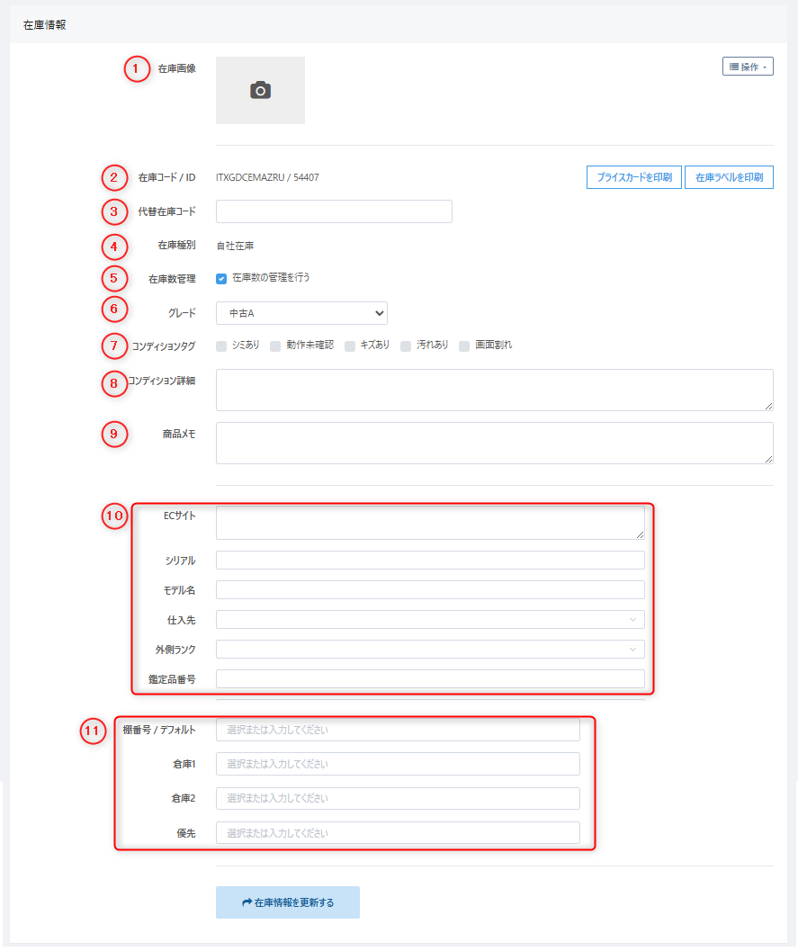在庫リスト画面など各在庫の在庫コード(ITコード)をクリックし、在庫の詳細画面上から画面より各情報を入力ご変更のうえ、【在庫情報を更新する】をクリックして情報を更新します。